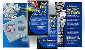 For a plastics color supplier, shows theme approaches plus some logo variants. Products sketched in.