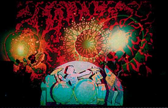 Images were staged for a photo shoot using a "cardboard" band and projections from actual equipment at a distance of 25 feet for brightness. An attempt to have a record of some images. Shot 35mm in 1989.
