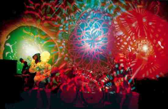 Images were staged for a photo shoot using a "cardboard" band and projections from actual equipment at a distance of 25 feet for brightness. An attempt to have a record of some images. Shot 35mm in 1989.