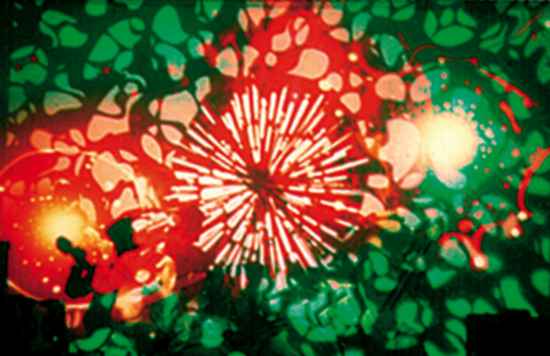 Images were staged for a photo shoot using a "cardboard" band and projections from actual equipment at a distance of 25 feet for brightness. An attempt to have a record of some images. Shot 35mm in 1989.